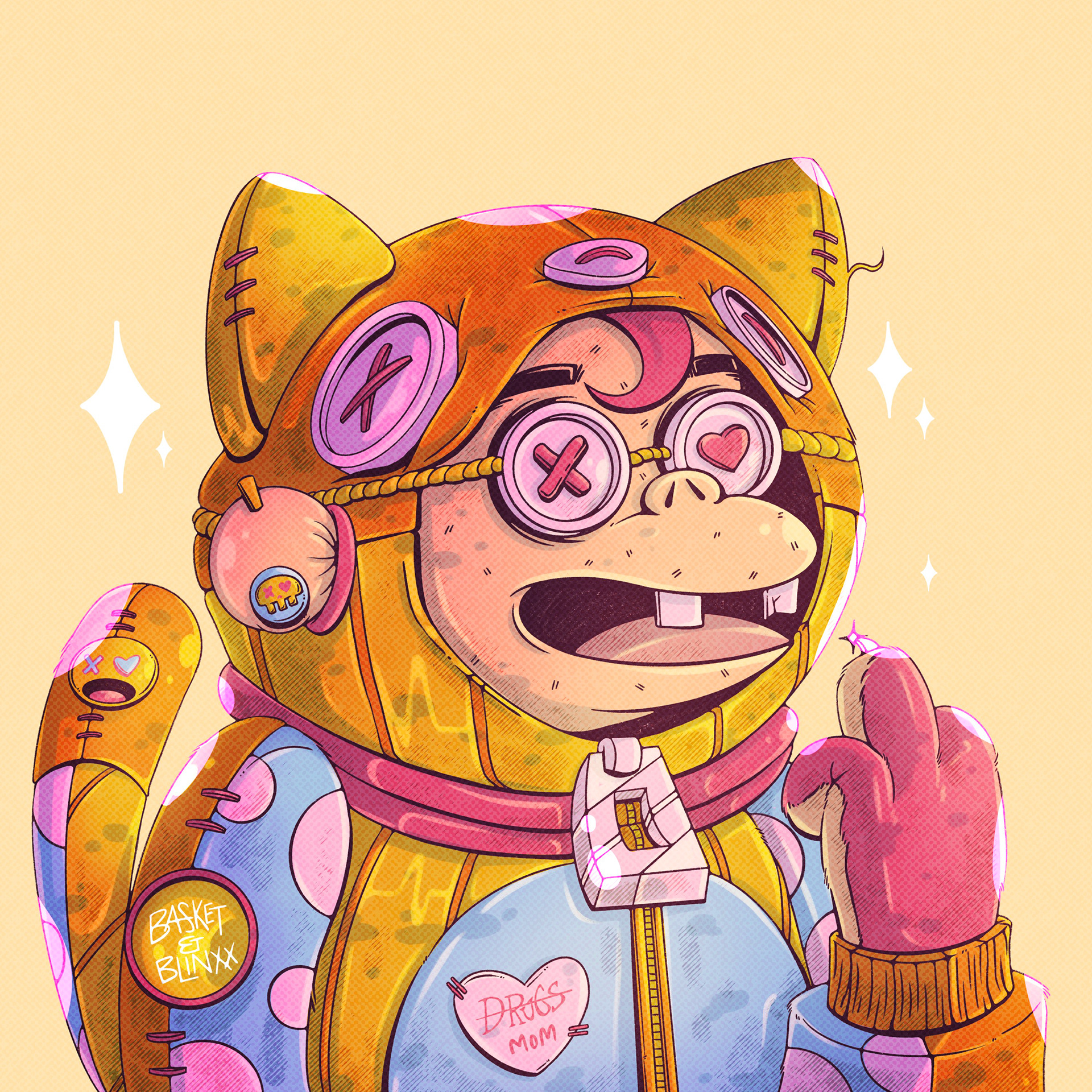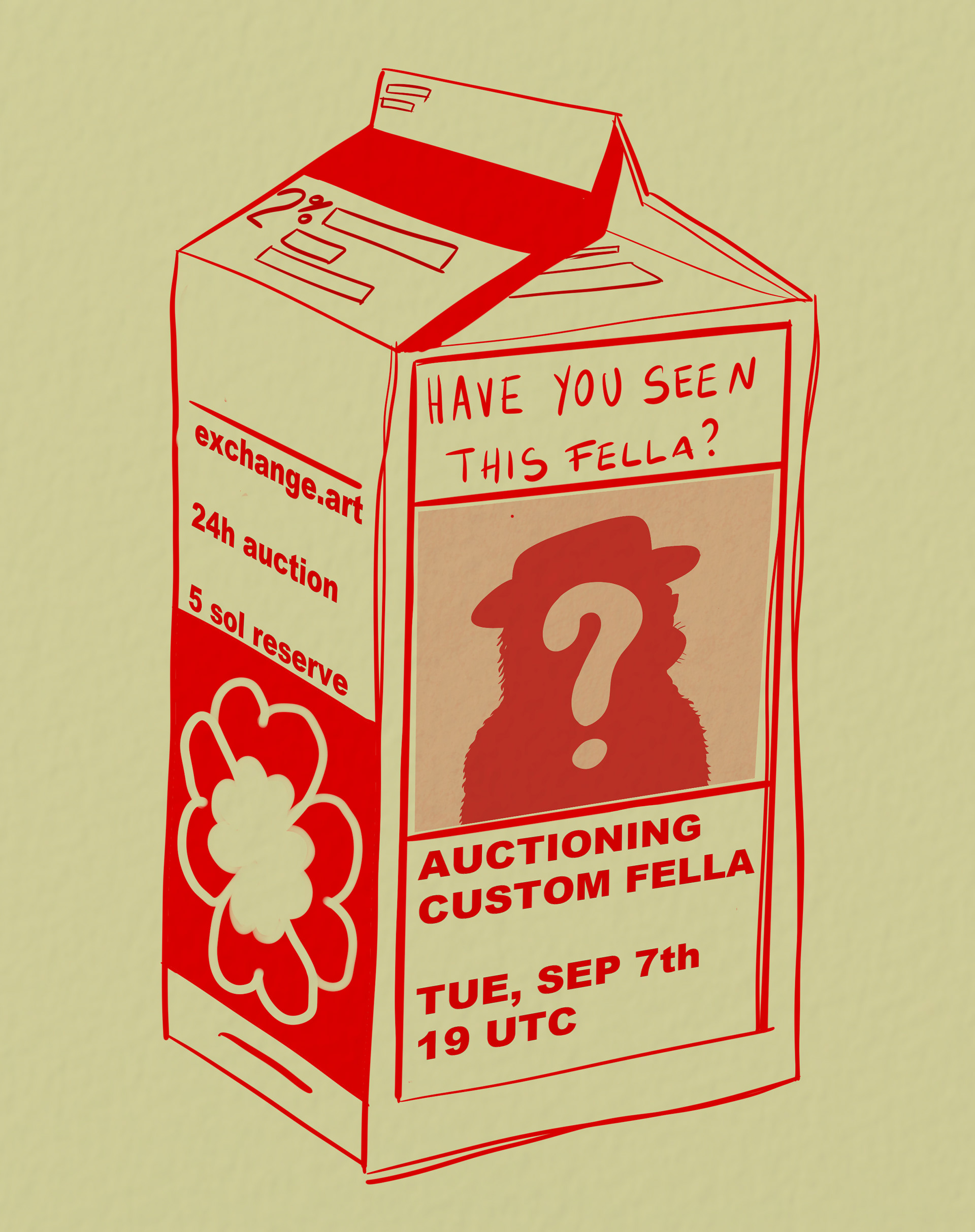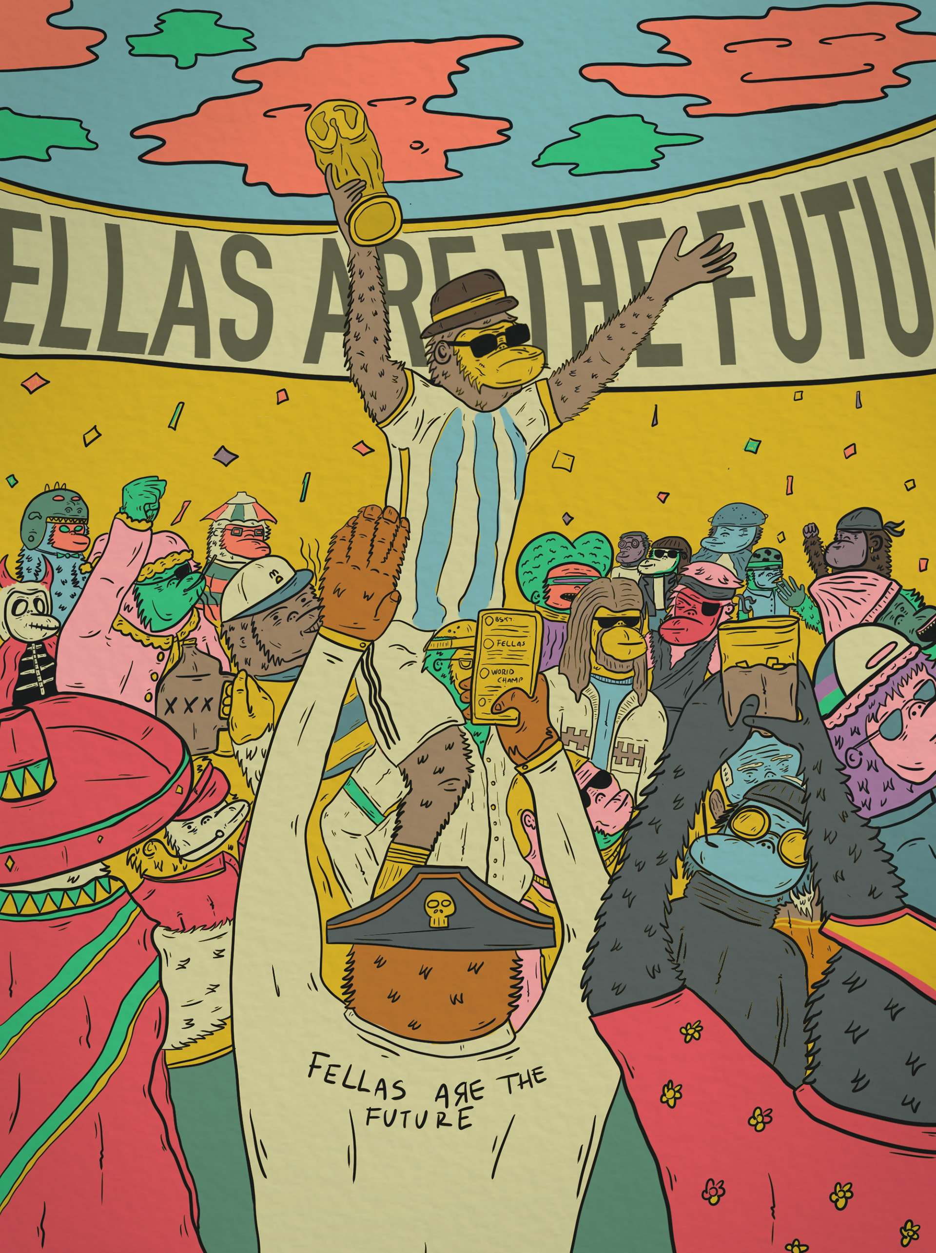 Fellas emerged during the early rise of boutique PFP communities on Solana, standing among the first to gain notable relevance. Conceived as both an experiment in portraiture and a study in character design, the collection became a bridge between art and community — a gathering point shaped by humor, pop sensibility, and digital culture. The name, a casual nod to friendship and shared identity, reflects the spirit of the project: informal, self-aware, and rooted in the intersection of internet culture, music, and visual art. Each piece reinterprets the recurring ape figure that defines much of the artist’s universe, exploring individuality through repetition and variation. Initially released in small drops that sold out within seconds, Fellas later adopted an auction model that reached record sales. Around it grew a network of collectors — the highest tier of support within the artist’s world — who gained access to exclusive artworks, collaborations, and ongoing community engagement. Collaborations with artists such as Scum, Hyblinxx, Nolegs, Ben Bauchau, and Utopia further expanded the universe, each contributing their own version of a Fella. Beyond its format, the collection endures as a cultural node — a testament to how digital art can create belonging, spark dialogue, and turn collectors into participants in a shared creative world.